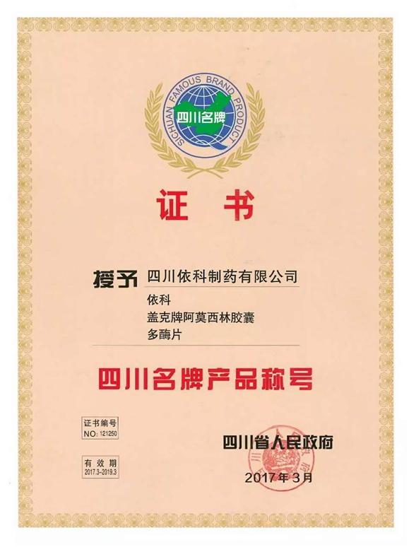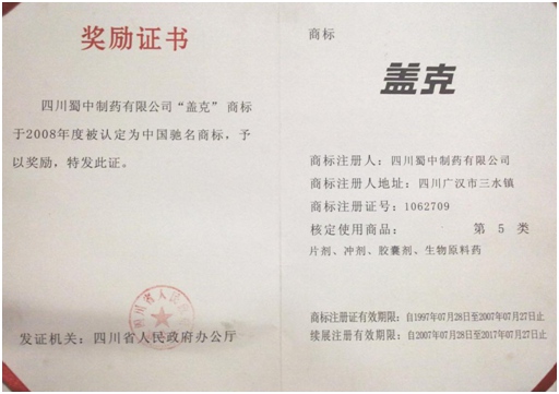 公司高度重视品牌战略,依法注册了“盖克”、“蜀中”、“三星堆”、“阿莫锋”、“益善源”、“蓉通”、“一同看官网gtv”等108件注册商标,1999年“盖克”、2003年“蜀中”、2007年“三星堆”被认定为德阳市知名商标,2001年“盖克”、2004年“蜀中”被认定为四川省著名商标, 2008年“盖克”商标被国家工商行政管理总局认定为“中国驰名商标”。2017年3月,公司盖克牌、一同看官网gtv牌阿莫西林胶囊和多酶片被四川省人民政府授予四川名牌产品称号。2016年,公司实现营业收入66373万元,利税7600万元;2017年,公司实现营业收入75045万元,利税7572万元。公司2017年被命名为德阳市第七批院士专家工作站,2016-2018连续三年被德阳市人民政府确定为重点龙头企业。